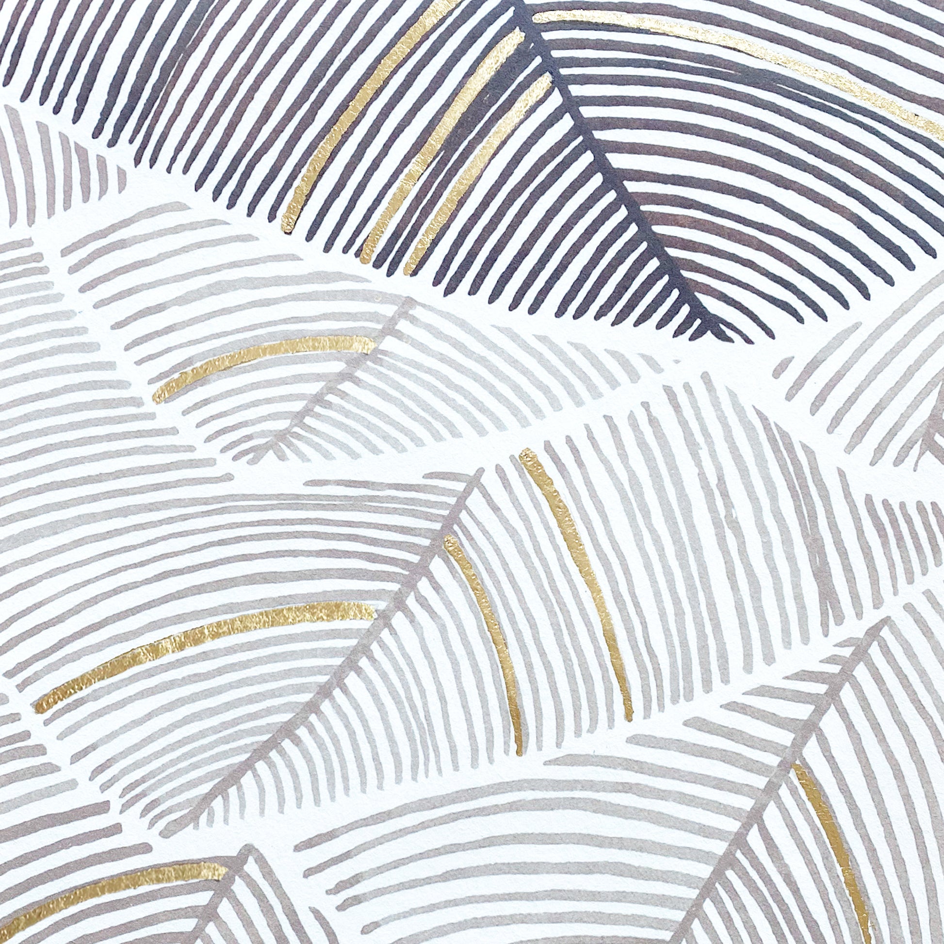 « Feuillu » est une forêt graphique dont le dégradé de couleurs apporte de la profondeur au décor. Ce tirage panoramique est réhaussé d'une dorure artisanale appliquée dans notre atelier parisien à la feuille de métal battu doré.