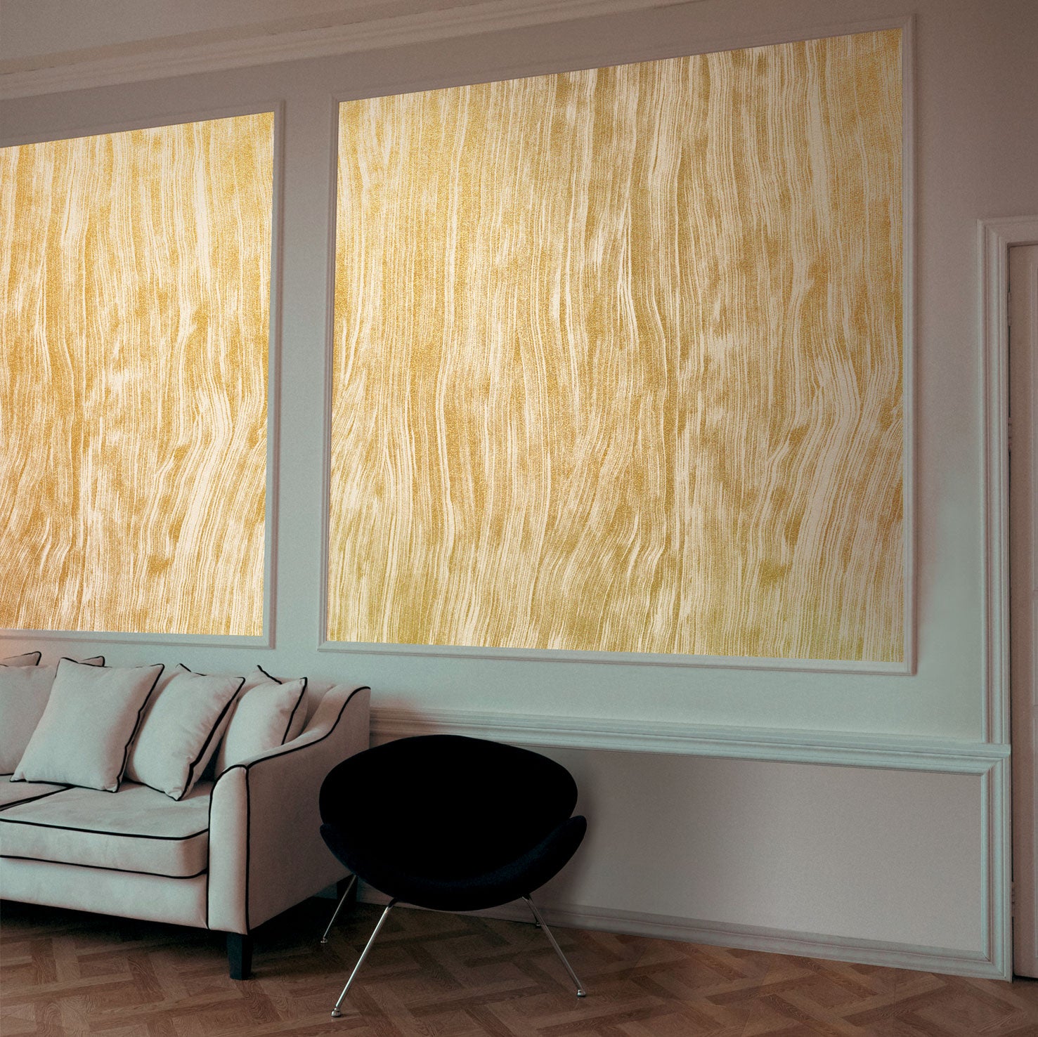 Les lignes blanches captivantes de "Frondaison" se déploient avec audace sur un fond doré somptueux, créant un équilibre saisissant entre modernité épurée et luxuriance précieuse.