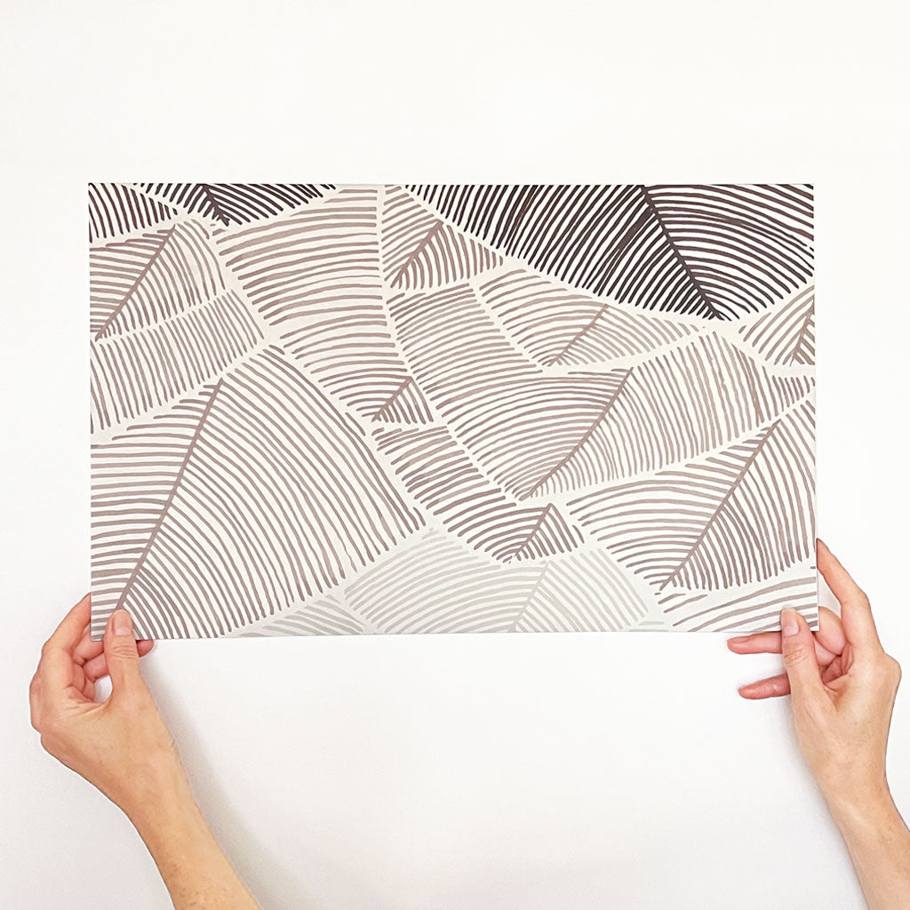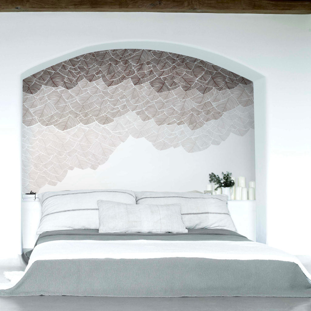 « Feuillu » est une forêt graphique dont le dégradé de couleurs apporte de la profondeur au décor.